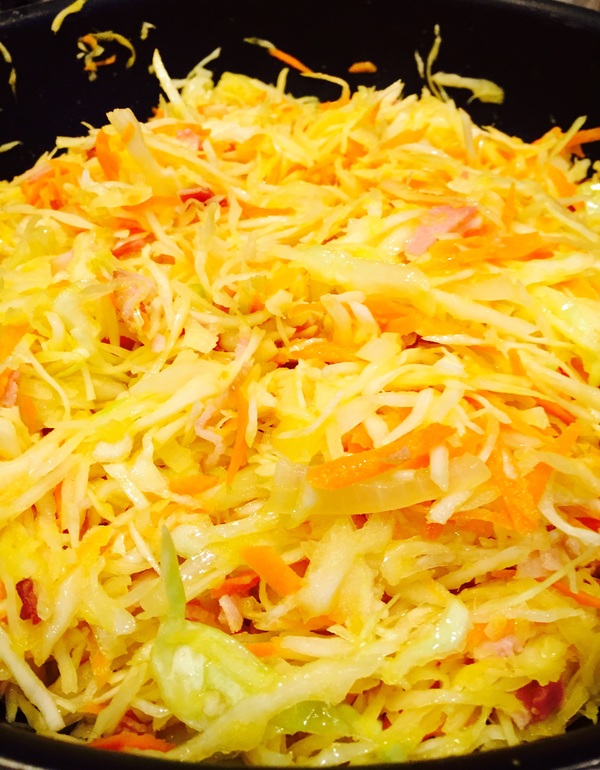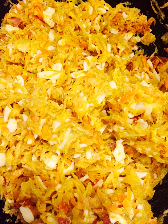 Вот оно чуть остыло, и яйца как раз тоже доварились и остыли. Я их почистила и на той же терке, что и капусту, захреначила в начинку. Посолила по своему вкусу и поперчила чуть свежемолотым перцем. Отставили.