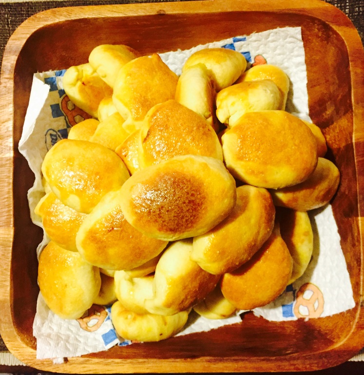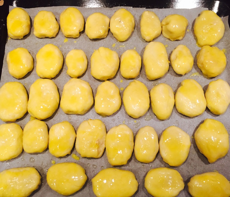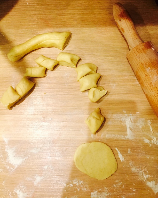 Я отщепила от кома теста часть, скатала колбаской, нарезала на калабашки. размер их варьируйте сами. У меня часть "пальчиковые" пирожки будут. А часть побольше. Пальчиковые, это года мужу неа один укус - мелкие. Я люблю крупней, поэтому - два вида.