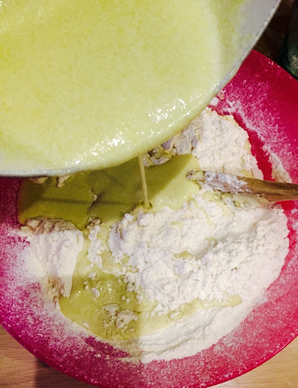И туда залили тонкой струей содержимое сотейника(кефирная смесь):