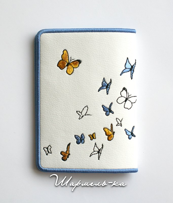 Вышивка выполнена вискозой на белой экокоже. Внутри обложки кармашки с фигурным краем из иск.кожи в тон верха.