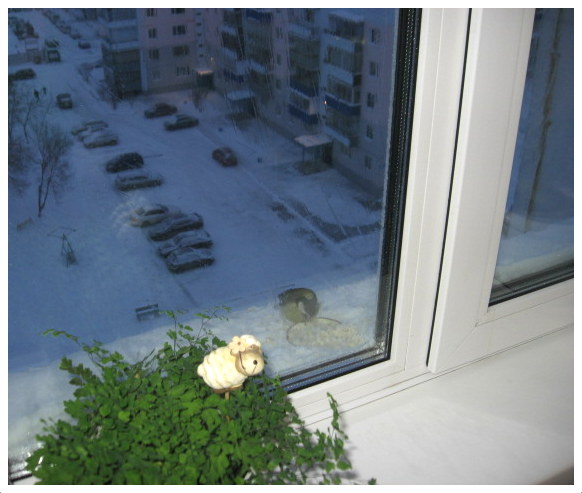 Кормим мы её салом мелко порезанным, пшеном и хлебушком. Сначала, когда я 1-й раз посыпала на подоконник хлебушек, она долго приглядывалась, часто пролетала вблизи окна, но не решалась угощаться, потом быстро хватать кусочки и тут же улетала, а сегодня стала прям садиться на подоконник и клевать, правда если близко подойти к окну, она пугается и улетает, поэтому мы потихоньку подкрадываемся к окошку и на небольшом расстоянии от окна наблюдаем за ней.
