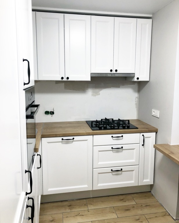 Пока фартука нету, но скоро будет. А ещё мастер кухни очень грустил что так мало места на кухне) а ручки на кухню покупали на али, красивее и дешевле.