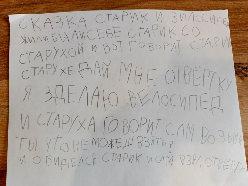 Жили были себе старик со старухой. И вот говорит старик старухе:" Дай мне отвёртку,я сделаю велосипед" и старуха говорит:" Сам возьми, ты что,не можешь взять?". И обиделся старик,и сам взял отвёртку.