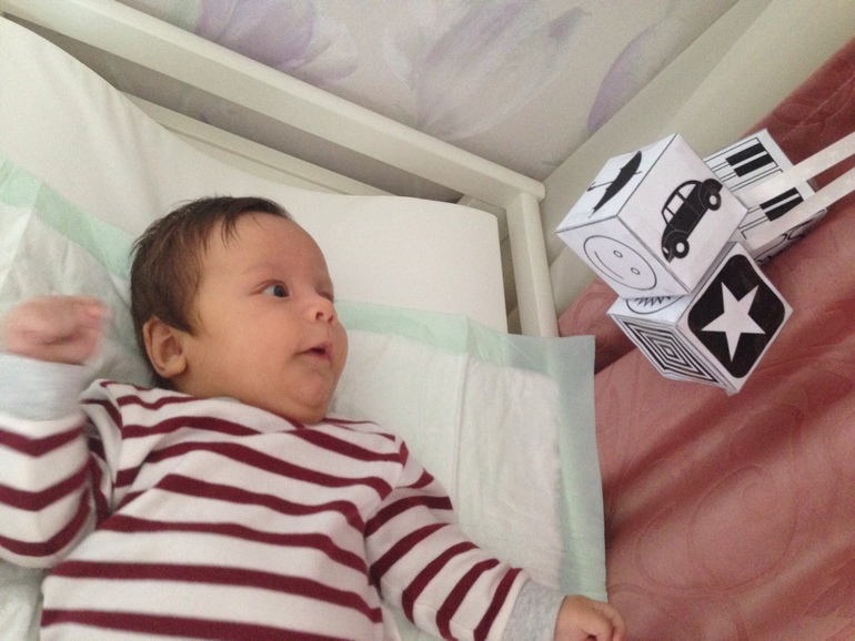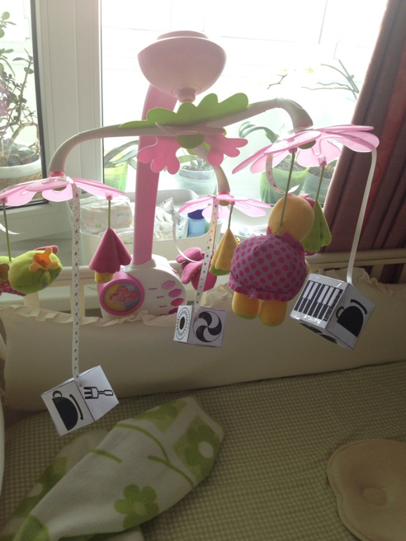 Хотели изначально мобиль сделать, но игрушки снимать оказалось слишком сложно, поэтому кубики просто привесили сверху.