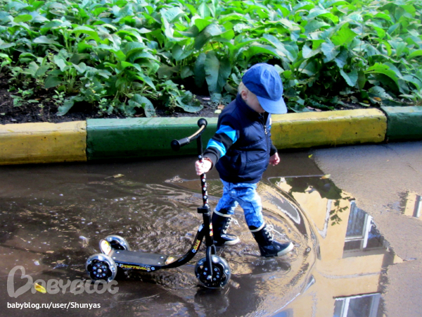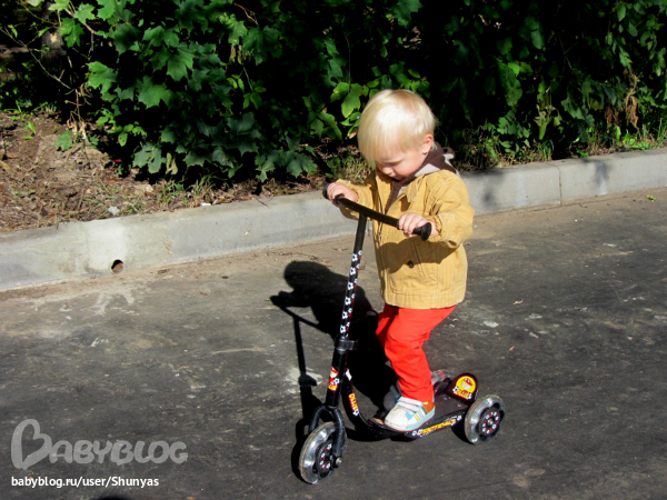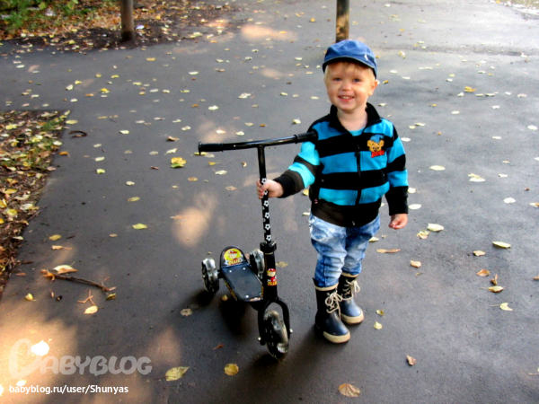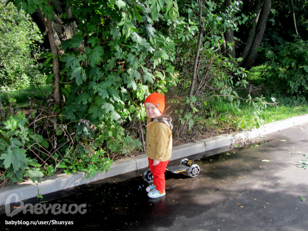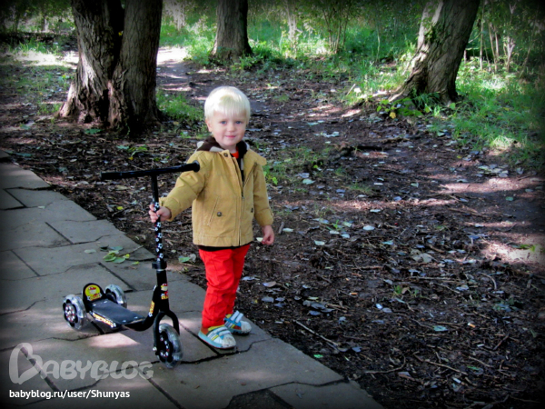 . Посидели(покатались) только минут 10 на чужом велосипеде...остальное время на ногах))) Некапризничал,слушался, но только наверно из-за самоката(даже нести мне его недает...все сам) катит и катит его)))) Дошли до парка, сделали там пару кругов....еле уговорила в обратную сторону идти...