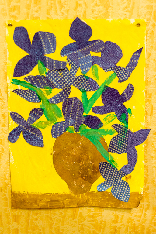 Когда я предложила Ромке выбрать любую понравившуюся картину, он выбрал Ирисы. Делали мы их в форме аппликации - вырезали из бумаги, которая осталась от новопоклеенных обоев - они практически такого же цвета и очень интересной текстуры на ощупь. Юнка разрисовала для нас желтый фон гуашью - она это дело любит,