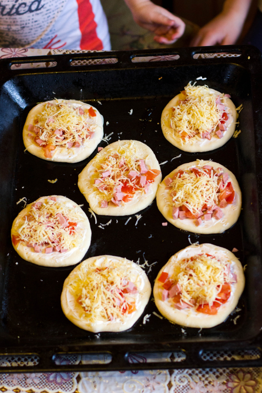 Я раскатала колобки, Юна смазывала лепешечки сметаной (не забывая при этом через раз облизывать ложку - наша Кися!!!), потом они с Ромашкой кидали порезанные заранее телячьи сардельки и помидоры и посыпали все тертым сыром.