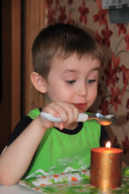 Ну и конечно же, растапливали снег над свечкой. Радости сына не было предела!!! Снег таял быстро, а потом и вода испарялась!