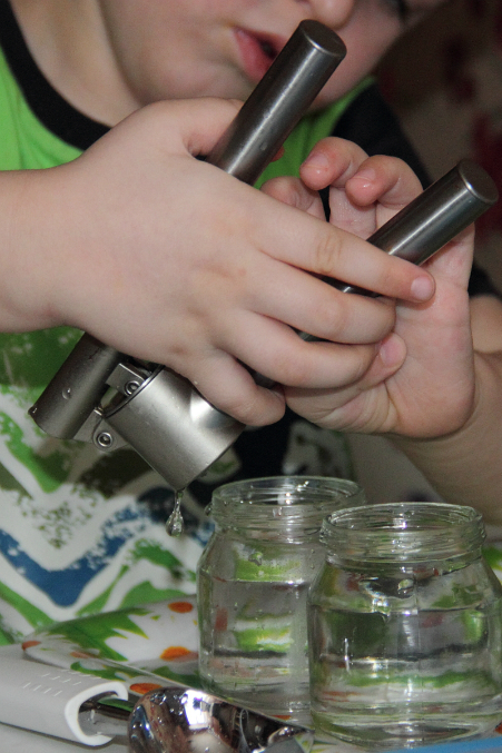 А вот результата этого опыта я не ожидала. Оказывается, если из чеснокодавился выдавливать снег, то не получатся снежные червячки, а только капельки!!! Лично я была удивлена, а Ромка просто навеселился в волю.