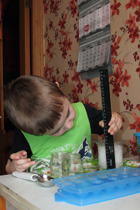 Набрали полную чашку снега, замерили линейкой. Снега было 8 см. Поставили на батарею. Пока проводили остальные опыты, снег растаял (приблизительно 35 минут). А вот воды оказалось гораздо меньше - всего 3 см. Объяснить вразумительно сыну я это не смогла (к своему стыду). Как-то про объемы и расстояния между молекулами- рано еще, а вот как доступно объяснить по возрасту - я не смогла. Рассказала, что снег занимает больше места, чем вода. Сына ответ устроил)))