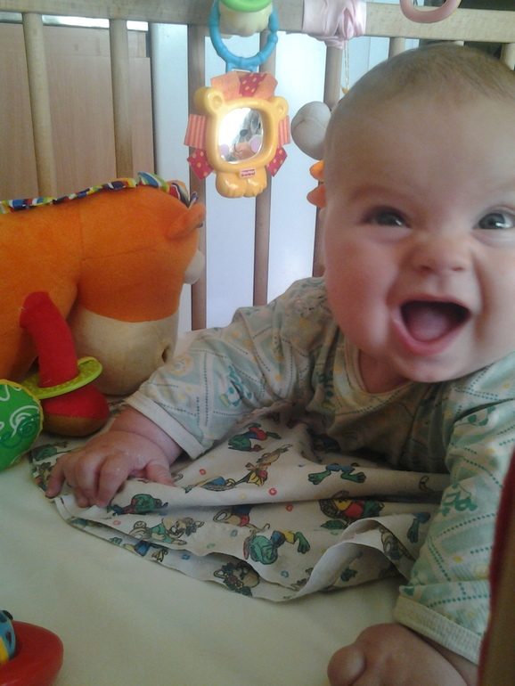 Ползать толком не ползает, лишь один раз уполз задом, пока никто не видел, с развивающего коврика - это где-то полметра. Повторить свой подвиг на бис отказался. : ) Зато вовсю вертится по этому коврику на животе: там потрогать, тут пощупать, здесь пошуршать. Вообще стал значительно дольше оставаться в таком положении. Любимые занятия: экскурсия по квартире на маминых ручках с обязательной опцией "приложить ко всему свою лапу", физические упражнения для ног, прыжки на маме. Последнее аж до радостного визга. Эксперимента ради пробовала развлечь его мультфильмами, заявленными как "для самых маленьких". Однако они оказались дитю абсолютно безынтересны. Зато он оценил мультики Диснея ("Бэмби", "Король Лев", "Леди и Бродяга"), посмотрев их целых несколько минут. Особенно его заинтересовали моменты, где звериные мордашки показывались крупным планом. Смотрели с папой в моё отсутствие "Том и Джерри", хохотали на пару. : ) Что ещё радует Вергилёнка: трава - любит, восседая на слинге на полянке, изучать её своими ручками; собаки - до ушей улыбается нашей Боньке, заливисто смеётся, увидев копошащихся и резвящихся рядом дворняжек; строить глазки папе, сидя на горшке. х)