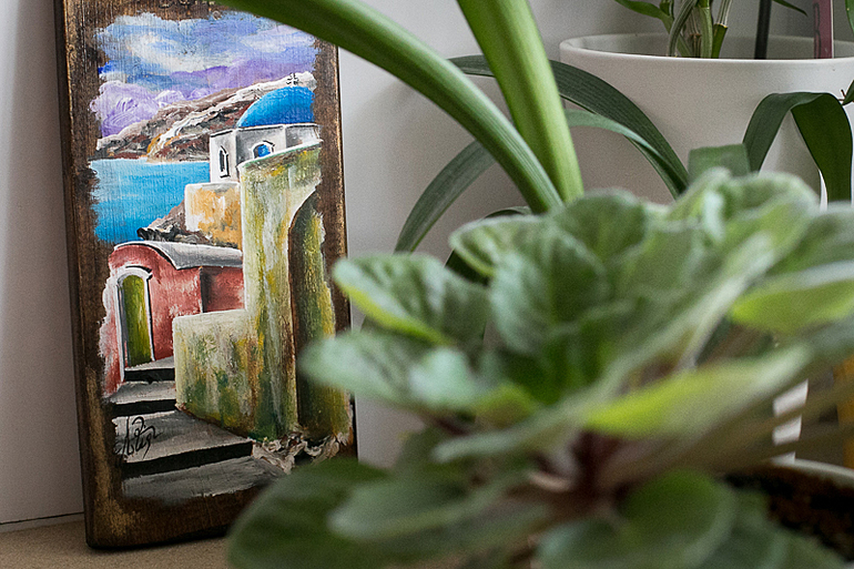 Ну, и напоследок - картина с острова Санторини. Вид на сказочный городок Ия и кальдеру - затопленный вулкан. Стоила эта малышка баснословных 40 евро (тогда, в 2010 году, муж возмутился - "за эту деревяшку?!" - ах, мужчины:). Хорошо, что жена художника, продававшая эти досочки в семейной лавке, не понимает по-русски, она бы обиделась:) Ведь она необычайно красочно расписывала все сложности процесса изготовления подобной росписи. В частности, как ее муж долго подготавливает древесину для будущих заготовок, вымачивая в пресной воде, а потом особым образом просушивая, чтобы дерево в процессе хранения (не дай бог!) не рассохлось и не потрескалось. Короче, товар умопомрачительного качества и высшей степени художественности:) меня она, конечно, убедила, а я убедила мужа, что из свадебного путешествия нам просто необходимо привезти такую штуковину:) И теперь мы наслаждаемся видом на Ию у нас дома.