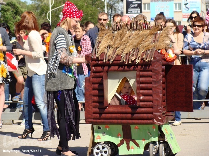 "Родом из детства" - коляска с "Домовенком Кузя". Понравилась! Избушка была интересно сделана, открывались окошечки, двери.. там сидел Кузя (маленькая девочка 2,5 лет. Жаль, что у нас сегодня было ветрено и паричок у Кузи немного сдувало, но зато такой забавненький получился: