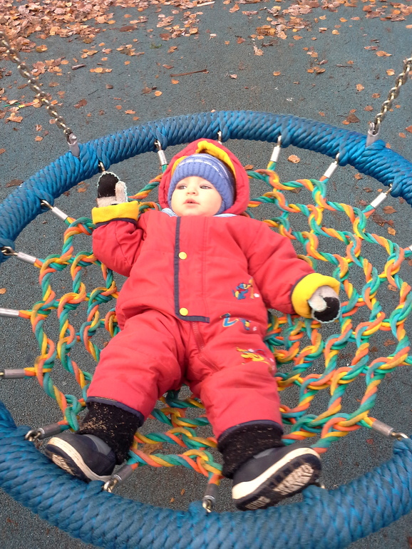 Но, руками то удобней. Может просто хаотично перемещаться в пространстве. На площадке желательно под горкой, лестницей и любыми другими конструкциями. На лестницы тоже любит залезать. Конечно, везде приходится согнувшись ходить с ним. За то очень полюбил качели.