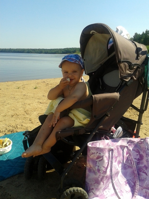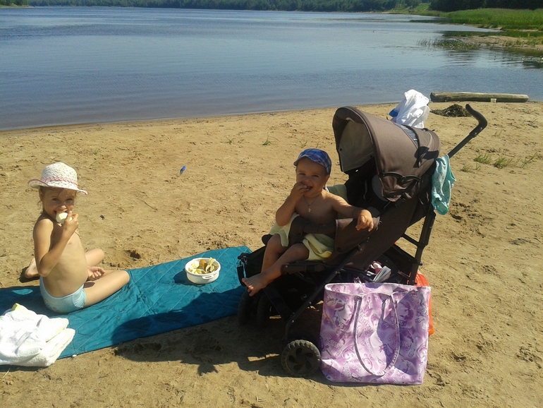 Для меня это серьезное испытание. К Тимке надо просто прилипнуть и не отходит ни на шаг. Мокрый, холодный лезет на глубину, скандалит - качай его, кувыркай в воде. На берегу замки строить - это не для него. Единственный шанс отвлечь и усадить хоть ненадолго погреться - дать что-нибудь пожевать.