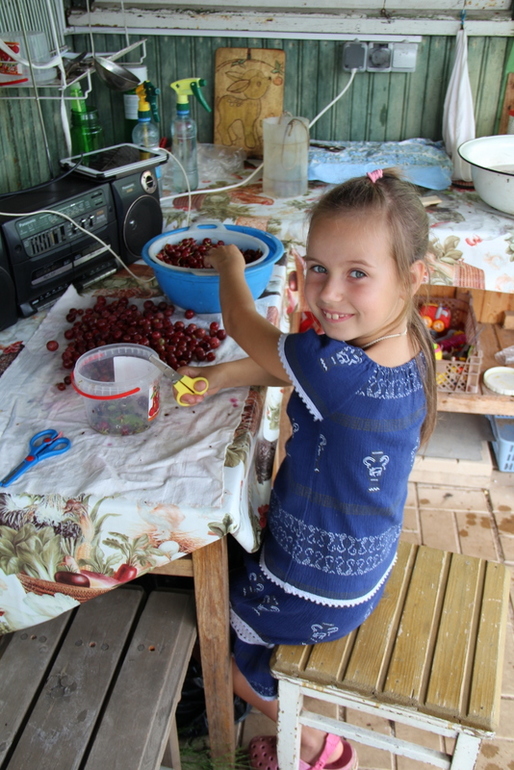 Саша стала моей настоящей помощницей. Может сама ведерко крыжовника почистить, например.