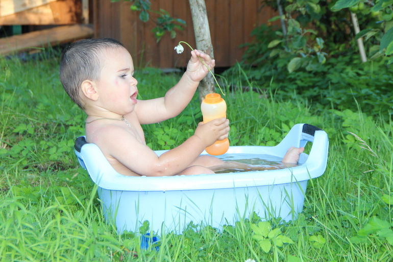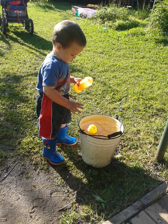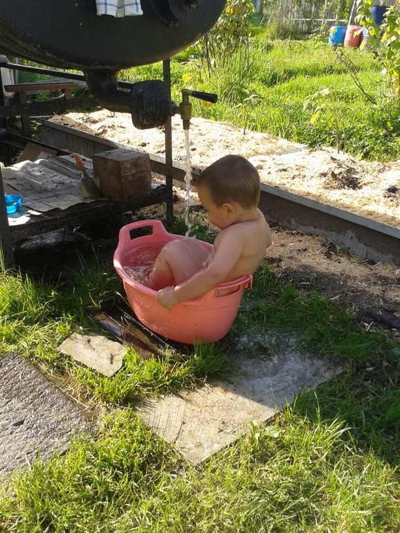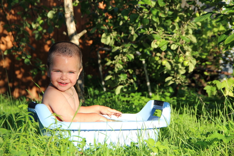 И еще фото в тазике. Только это у соседей младшенький нашел кран, приволок ближайшую посудину и устроил себе купание.