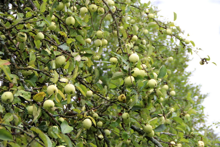 Яблоки тоже собирает хоть и в небольшом количестве.