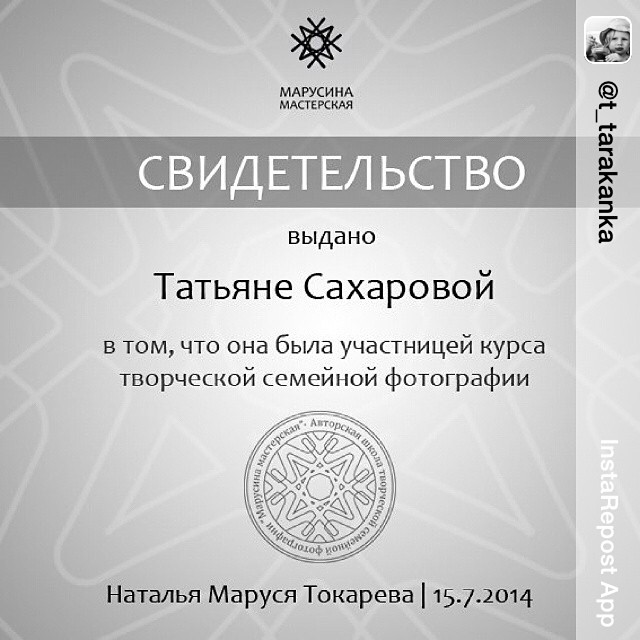 Repost from @t_tarakanka , "Это пока не диплом, но я надеюсь все впереди. Маруся @photomarusya , спасибо! Друзья, всем кто увлекается фотографией, живет ей, кто хочет расти и развиваться - всем рекомендую Марусину Мастерскую. Настоятельно!)))))". А от себя замечу, что мне бесконечно нравятся наши свидетельства и дипломы :-) а уж от логотипа из букв М я вообще умираю :-) Натали Михлин - чУдная :-)