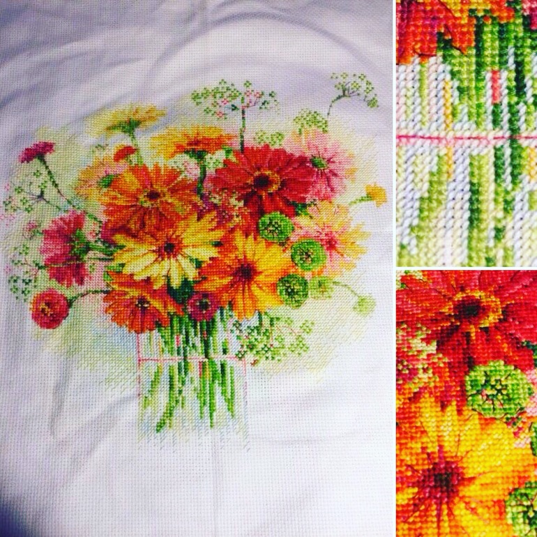 Вторыми были вышиты герберы. И качество ниток мне показалось похуже и канва, но и цена у этого набора меньше) здесь уже запал остыл и вышивала 1,5 месяца. Правда параллельно вышивала ещё и флоксы)))