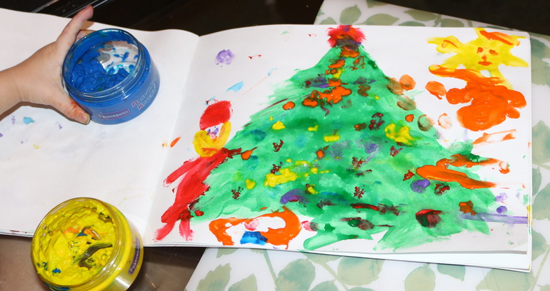 Не могла не поделиться этим шедевром))) С елочкой и огоньками всё и так понятно. Справа от елочки светит солнышко ... оранжевое пятно под ним - животик. Потому что не может быть солнышка без животика :) За елочкой спрятался Дедушка Мороз.