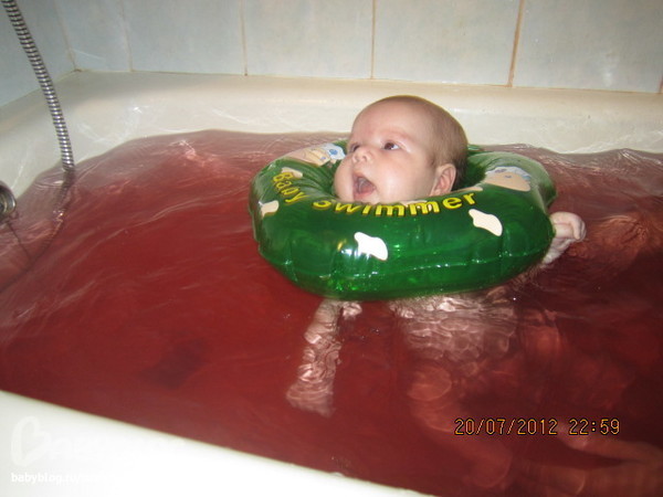 вчера купили круг плавательный и первый раз его испробовали))))) по совету мамы (за что ей спасибо), в ванну забрался муж (дабы сынок не напугался и не воспринял ванну как океан)))...а потом , надев круг, (больше всего боялась что сын будет крехтеть при надевании круга, но все обошлось)) опустили сына в воду....Он сначала пытался понять где он и что это такое))) а потом как резко начнет ногами двигать))да так быстро))))) мы с мужем со сторонф навреное еще забавнее выглядели))защебетали в один голос слова умиления)))). Через секунд 30 сынок замер))) отдохнуть решил))потом снова)))....так его хватило минут на 10..потом начал крехтеть и капризничать...видимо на столько двигался, что еще сильнее прогладался))) Мы его оперативно вытащили и пошли готовиться к приему пищи и сну))). Уж не знаю это повлияло или что-то другое, но сын проспал 8(!) часов подряд!!!))) красота)))