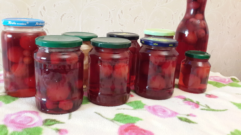 Варенье что-то не прёт в этот раз. А вот компоты хлебать мы любим. Поэтому появились вчера первые банки к зиме) алыча, вишня, слива, крыжовник, пЭрсик в сиропе) справа пробник, щас на сахар проверю)))))