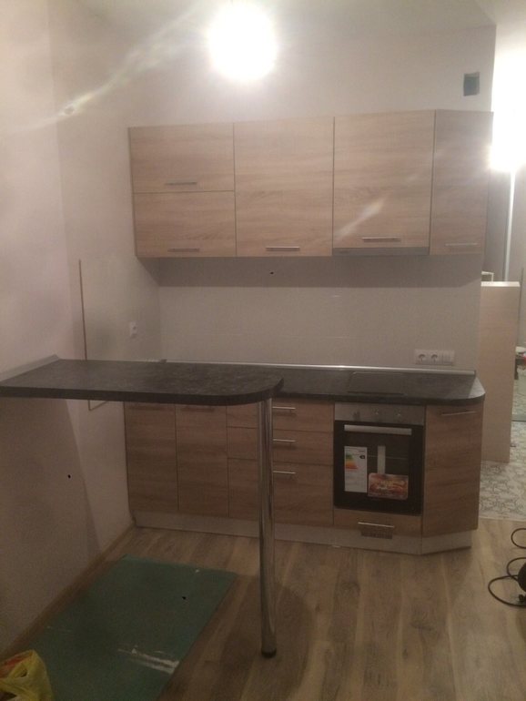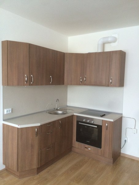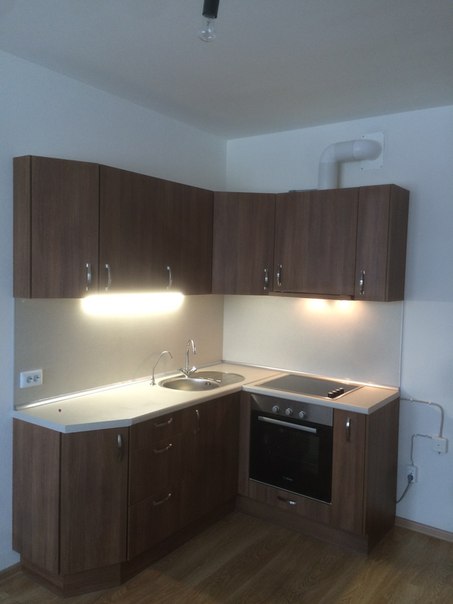 Вот небольшая кухня для студии. Делали в среду. Здесь фасады сделаны из немецкой плиты дсп с мощно приклееной кромкой абс. Так же тут простая фурнитура. Это у нас два с лишним метра по стене. 54тыс.