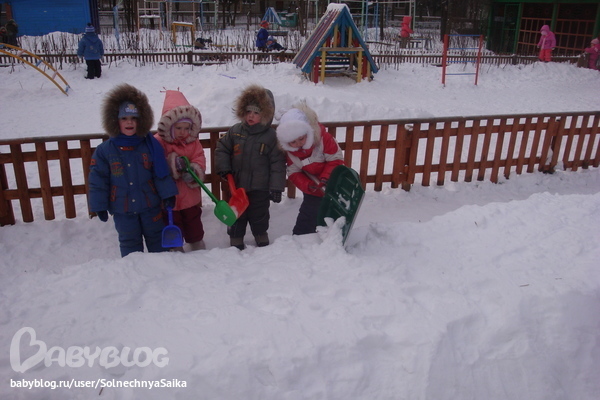 Гуляли мы с Катей на той недельки и решили навестить Софию в детском саду. Приезжаем, а они там горку строят. И что вы думаете, все детки со своими лопатами, а Соня наша, взяла лопату у воспитательницы и опять руководит процессом: