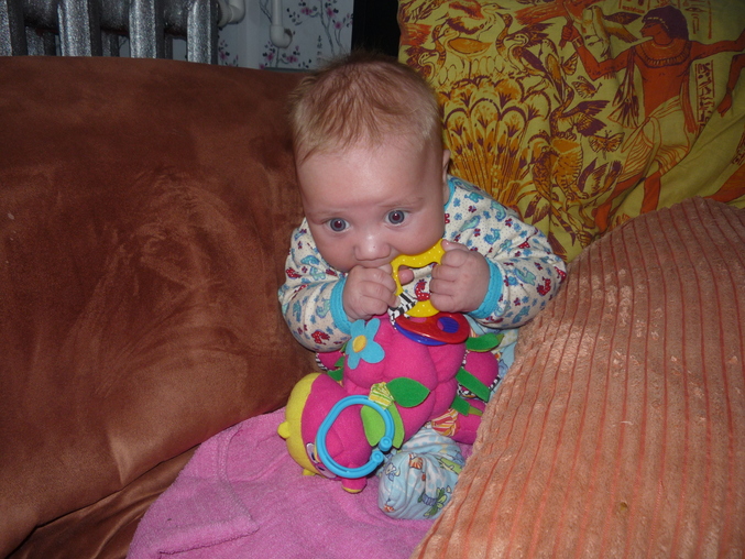 Вчера сходили с мужем и детьми в кафе, вечером сидим играемся с дочкой, я смотрю...что-то на десне белое, точка какая-то, есть припухлость немного, сегодня мне уже кажется что остренький уголок появляется))обалдеть!!! как рано!!!! у сына только в год и месяц появились, но зато сразу все)) А я то думаю, откуда у нас сопли взялись и такое количество слюней)) роки изо рта она не вытаскивает вообще)) ранняя у нас что-то мадам... вот и ушки планируем месяцев в 6 проколоть...