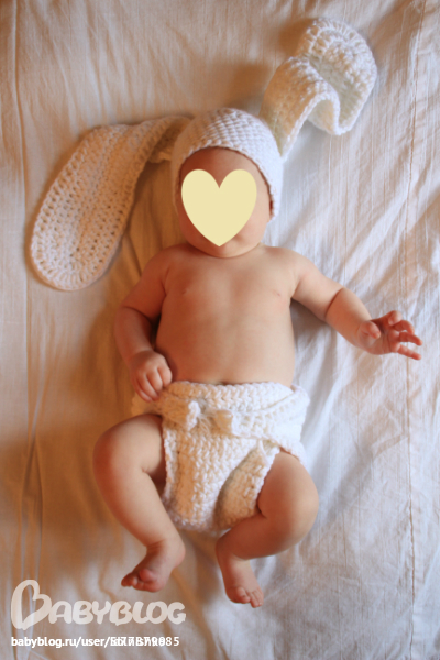 Набор для фотосессии "Зайка":) Связвнный крючком комплект шапочка и подгузник. Примерно на три месяца. Голова 39см, вес 6кг 500рэ