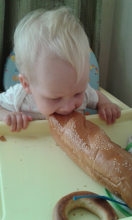 Едим овощи и мясо в виде детского супчика. Распробовали баночные пюрешки фруктовые, пьем детский кисломолочный напиток Крепыш (подсадила на него всю свою семью), ну и подтаскивает, что возможно, из наших тарелок.))