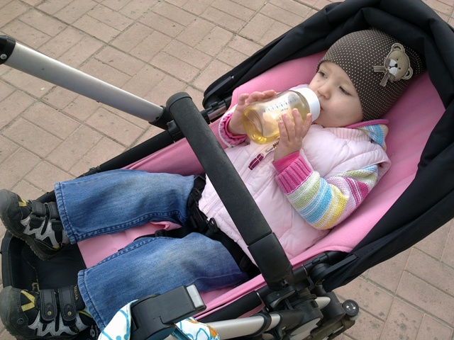 Классно ! А моя на улице спит, а если просыпается, то орёт так, что все соседи вылазяют из окон. Только после "затыкания" ртасоской снова засыпает. А так, чтобы по сторонам смотреть, это мы пока не умеем !
