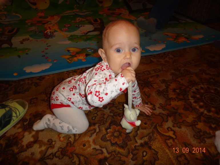 Довольно резво ползает на четвереньках, особенно за фотоаппаратом.