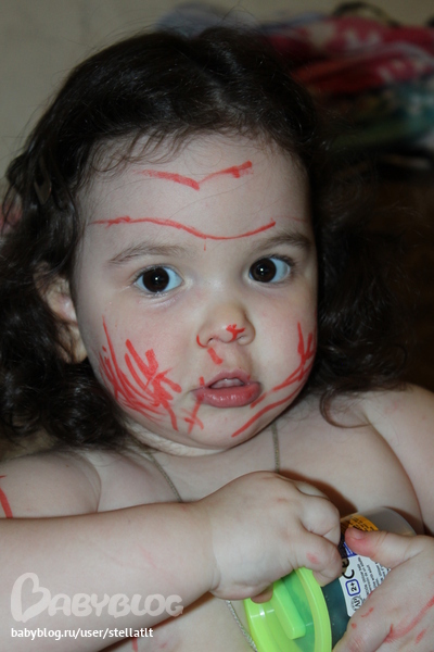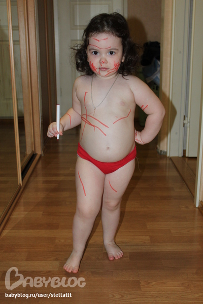 Но не яйца... а себя :))) Сегодня днем наконец то вышли на улицу... а там дождь... делать нечего идти надо.. надо покупать яйца.. куличи и на почту надо... В общем пошли.. я еще молодец взяла нашу перегу... сразу вспомнила какая она неповоротлива яи неудобная :((( у меня от нее за сегодняшний день спина разболелась :((( В общем то не в этом суть :) после развивашки и почты вечером (утром так и не отправили ничего) пришли домой. поговорили по скайпу с мамой и я пошла на кухню красить яйца и мыть посуду, А Софа как всегда туда сюда ходила! Перед тем как я ушла, убрала все фломастеры на самую высокую полочку в Софийкином шкафу с игрухами... занимаюсь своими делами, думаю странно что-то как-то долго Софа ко мне не заходит. но слышу рядом щебечит и хихикает.. думаю пойду посмотрю, чем же она увлеклась... а она казюлина такая достала фломики все таки встав на перило у кресла... и стоит перед зеркалом в коридоре и расписывает себя!!! А была она в красных труселях и фломик красный.. вот честно даже отругать не смогла так мило она выглядела :))))) и так шкодно :))) Слава Богу фломики из икеи хорошо отмываются и мы быстренько их смыли в ванне :))) Вот такая милашка :)