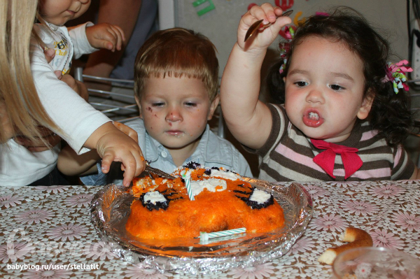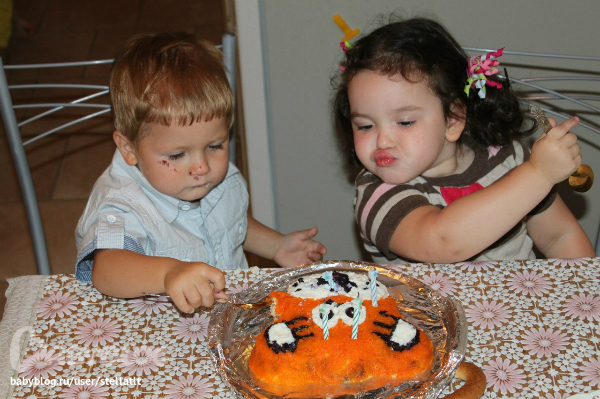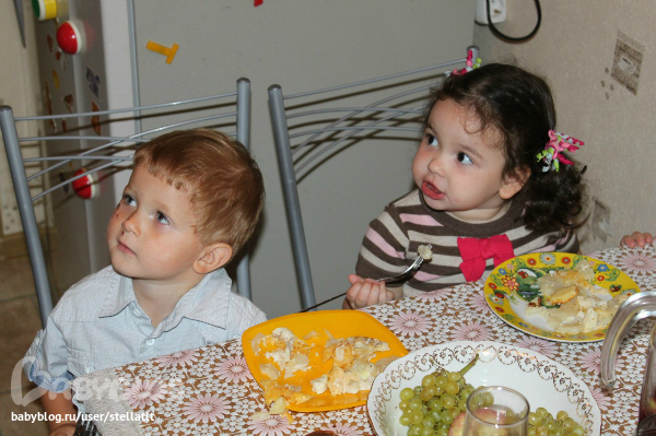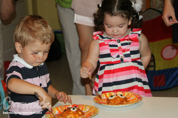 Кушают свои тортики :) София съела все макароны со своей тарелки и потом приступила к макарошкам с Илюшиной тарелки :)