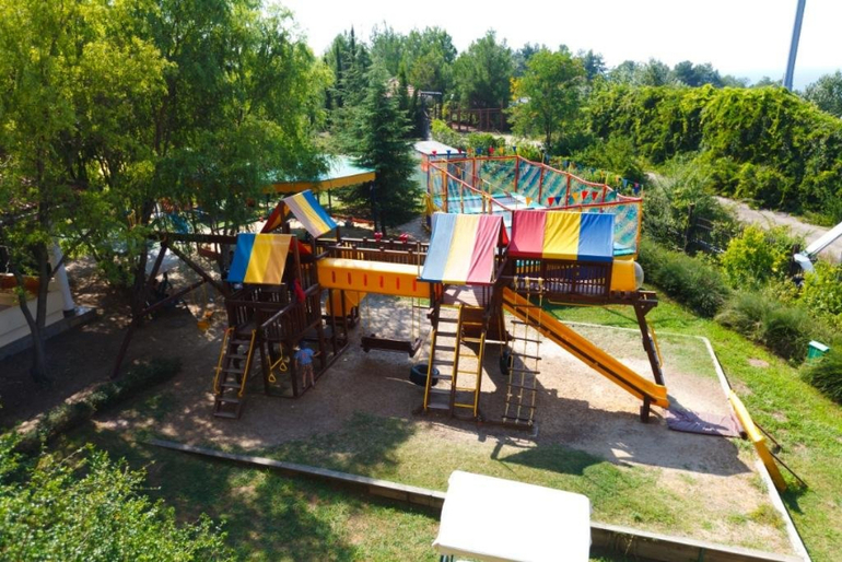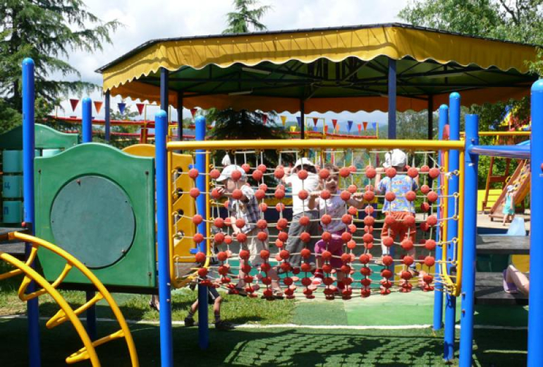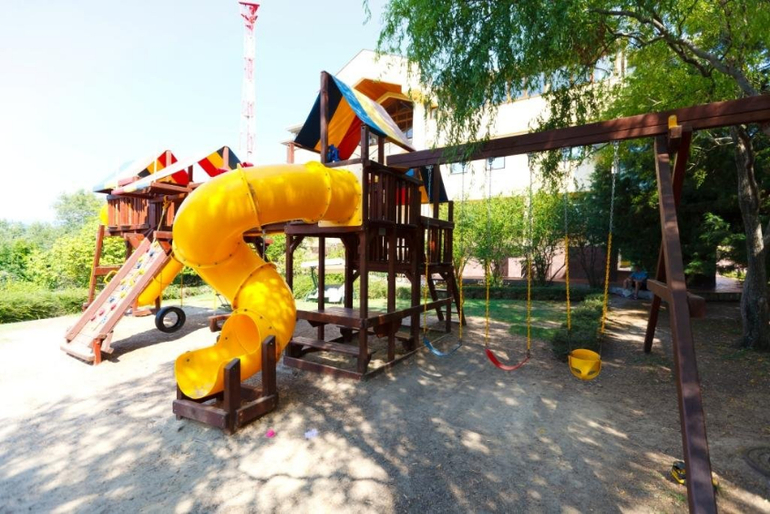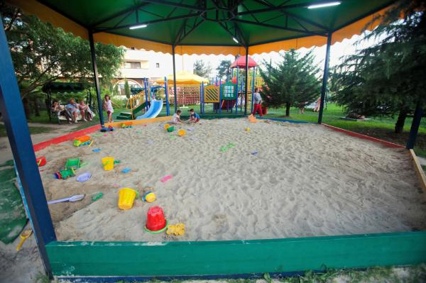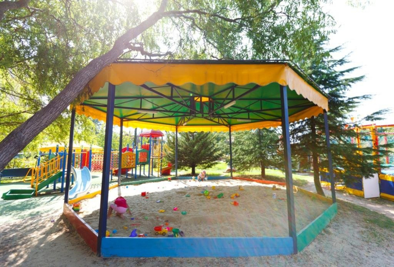 Для детей в пансионате настоящий водный рай. В нескольких бассейнах (крытых и открытых) оборудованы детские водные горки, детские отделения в бассейнах. Это настоящий аквапарк для самых маленьких. Есть так же детский городок, площадка для игр, батут, детская комната с услугами няни, дневная и вечерняя анимация для детей и взрослых. Огромная песочница с навесом!