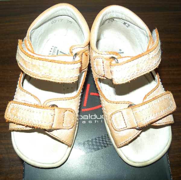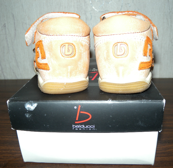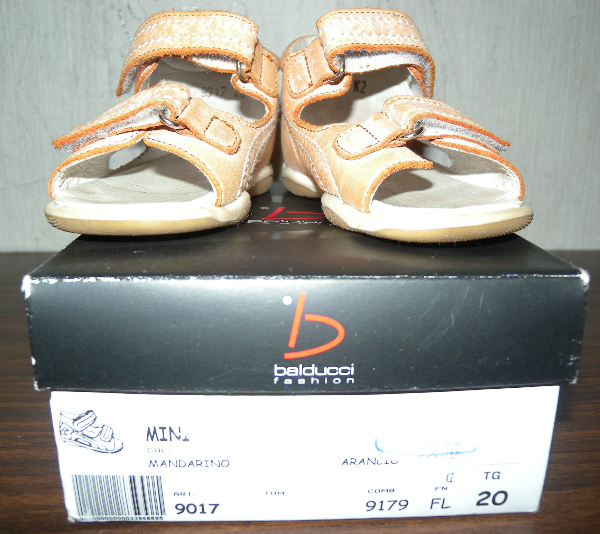 Босоножки Balducci, Италия. Куплены были там за 50 евро на распродаже. Размер 20, на 12,5 впритык. Носили мы их очень мало, все лето в 19 размере пробегали. Полностью кожа, верх - нубук персикового цвета, жесткий задник, супинатор. Состояние отличное. Модель очень удачная - и к платью, и к джинсам подойдет. Цена 800 400 рублей.