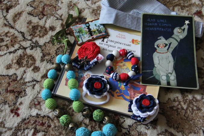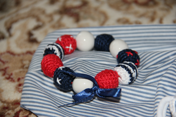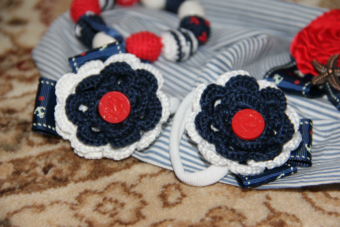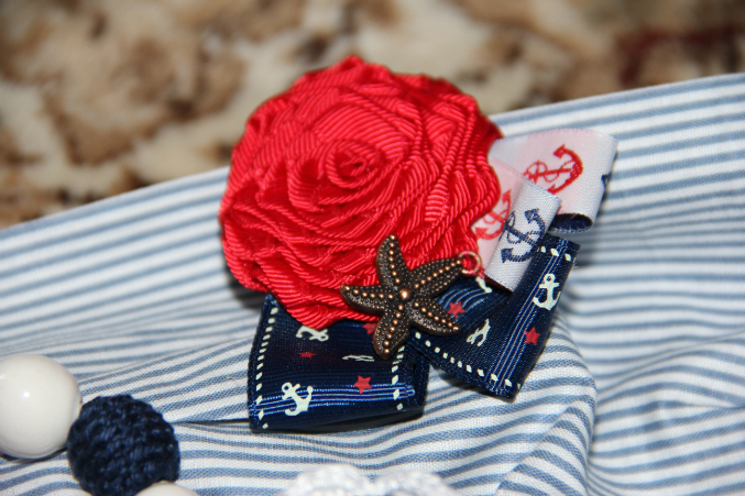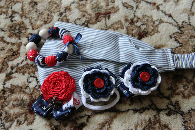 Кире Маша сшила банданку, связала резинки для волос, брошку и браслет. Все в морском стиле!!!! К нашему купальнику;) А еще нам бабушка белую кофточку подарила, я как раз находилась в раздумьях, чем бы таким ее украсить. Украшение найдено!!!