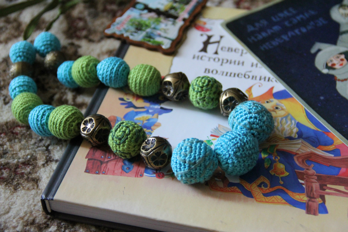 И мои бусы, которые Кира тоже считает своими))))) Маш, в открытке ты написала про их бирюзово-зеленый цвет - из-за моего имени или разнообразных глаз?;))))) Знаешь, что они у меня цвет от зеленого до голубого меняются в зависимости от одежды, настроения и погоды? Так вот, стоило мне их надеть, как глаза растерялись, и как начали со скоростью света цвета переключать!!))))))
