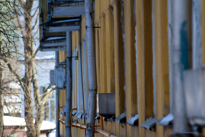 Старая пятиэтажка. Вся звенит, журчит. По железным трубам течет талый снег с крыши