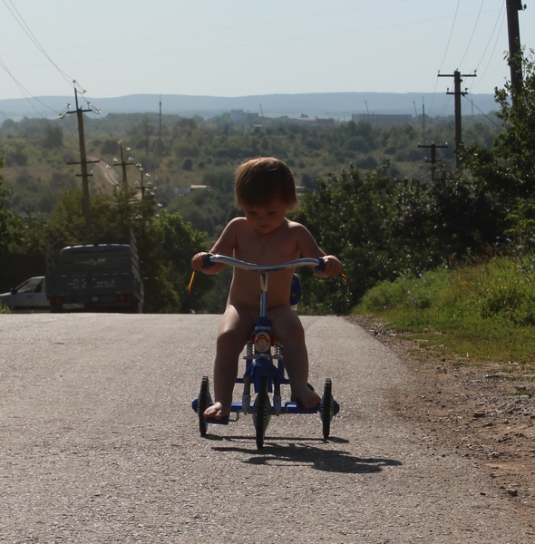 отважная мадама- голышом и босиком на велике!!! :))) мы чусую велик тож скоро освоим- как крутить педали знаем, тока ноги чуток коротковаты :)))