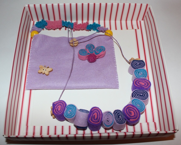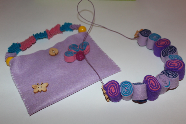 Фетровые бусики и сумочка ) Алиса прям-таки фанатеет от сумочек )) На прогулку без сумочки не ходит )) Норма - это, когда две сумочки с собой.