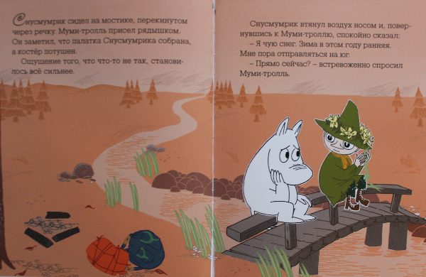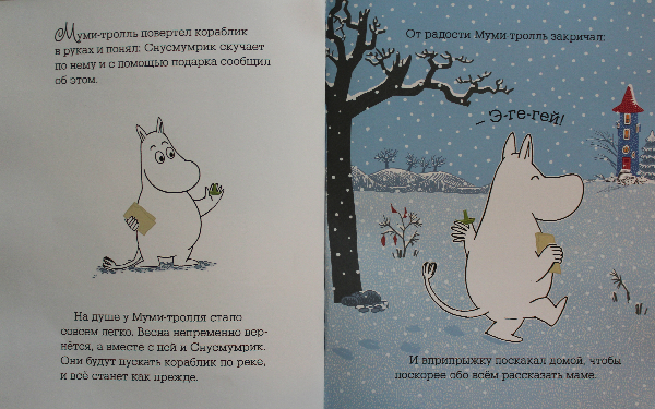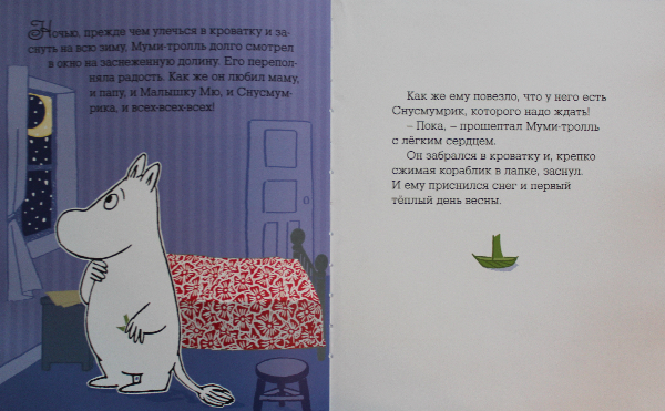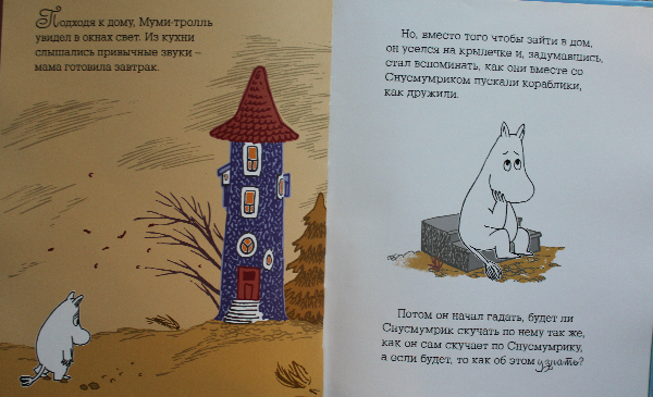 Очень приятная книжечка - нравится даже просто держать в руках, а история такая трогательная, душевная - лучший друг Мими-тролль - Снусмумрик отправляется в теплые края в связи с приближением зимы, а Муми-тролль очень переживает по этому поводу и скучает.
