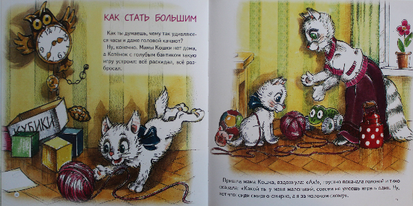 Особо тщательно она изучала историю о котенке, который оч хотел стать большим, нескольк раз пробовал это сделать, но у него никак не получалось, а оказалось, что всего-то нужно научиться собирать игрушки - и опля - ты уже большой ))