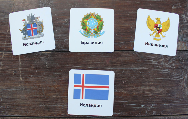 Прежде, чем продолжить рассказ о составляющих комплекта, отмечу, что мы этот комплект в занятиях чаще всего используем совместно с другими географическими комплектами и материалами во время знакомства с очередной страной. Я достаю не только флаг и герб той страны, с которой мы знакомимся, но и 4-8 гербов и флагов других стран - чтобы поиграть и позадаваться вопросами, ну, и чтобы усложнить Алисе задачу, вспомнить уже знакомые флаги/гербы и лучше запомнить новые.