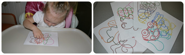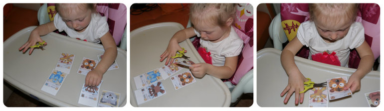 Тут я уже хотела заканчивать, но Лиза попросила "еще" , дала ей ножницы, надо ж практиковать. В этот раз сделала ей распечатки маленького формата, а то надрежет и берет другую картинку, так и бумаги не хватит.