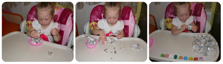 Но тут Лиза решила не затруднять себя разворачиванием, хотя это было проще, а отрывала по кусочку, что тоже развивает моторику, и нарвала такую кучу