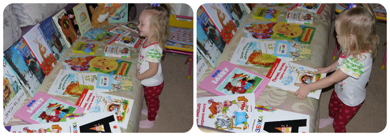 Мы немного приболели, поэтому библиотеку мы устроили дома, а книг дома и так как в библиотеке, скоро начнем выдавать читательские билеты подружкам.