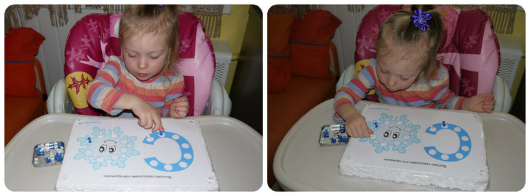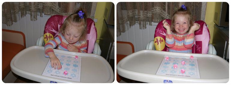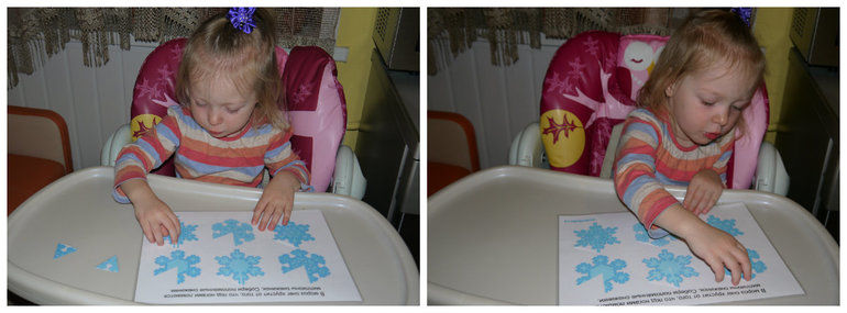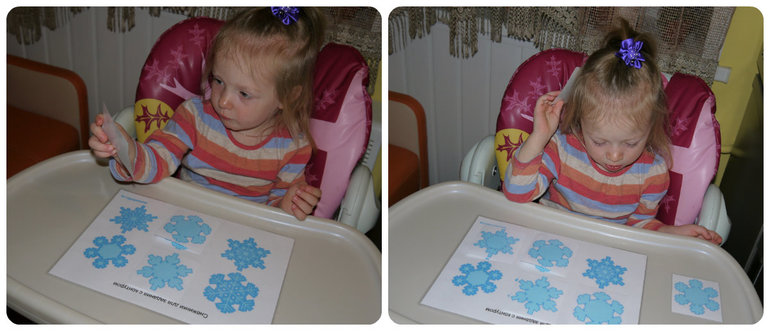 Надо подобрать соответствующий кусочек к снежинке. Делали вместе, но Лиза 3 снежинки сама подобрала.